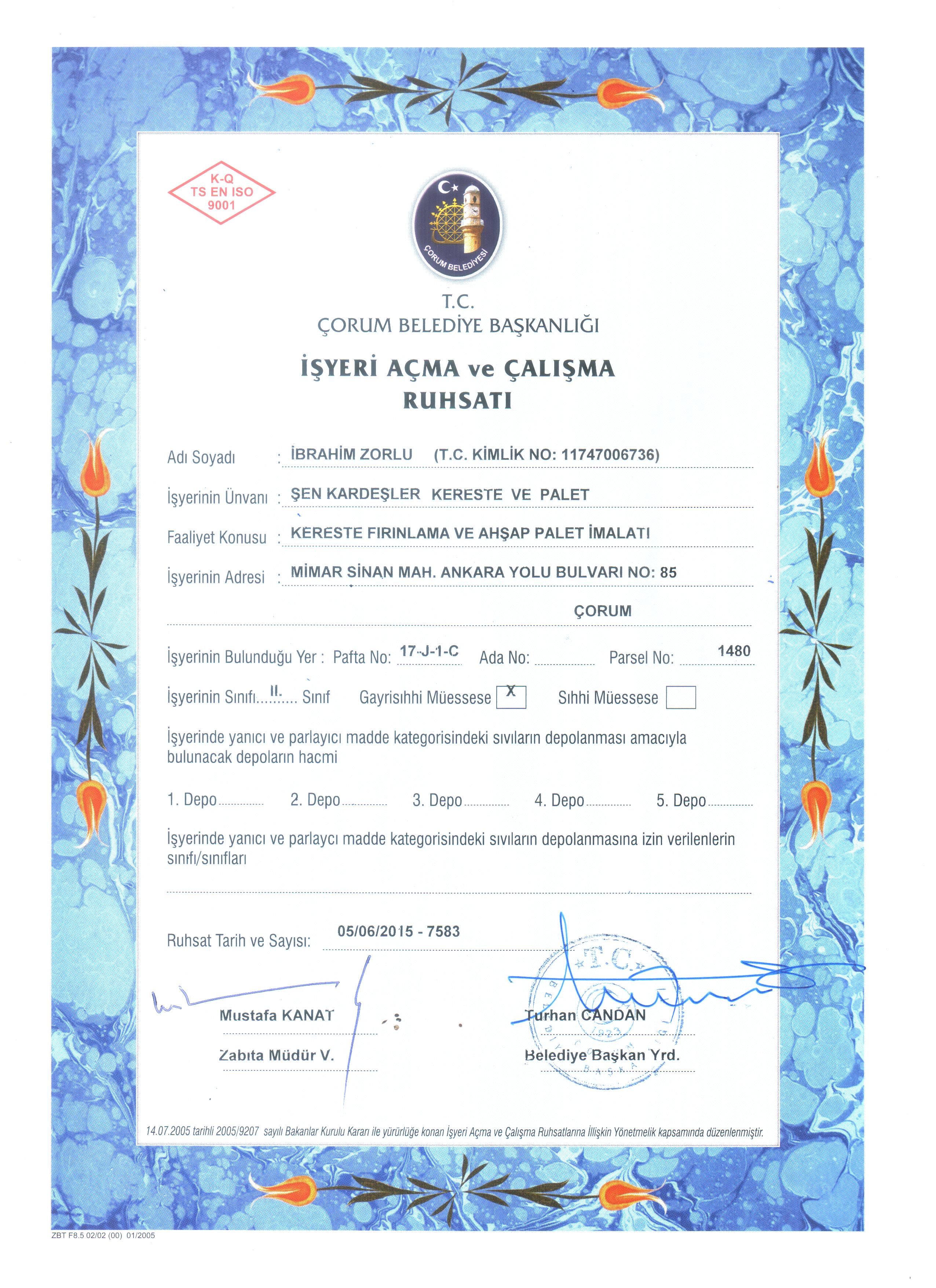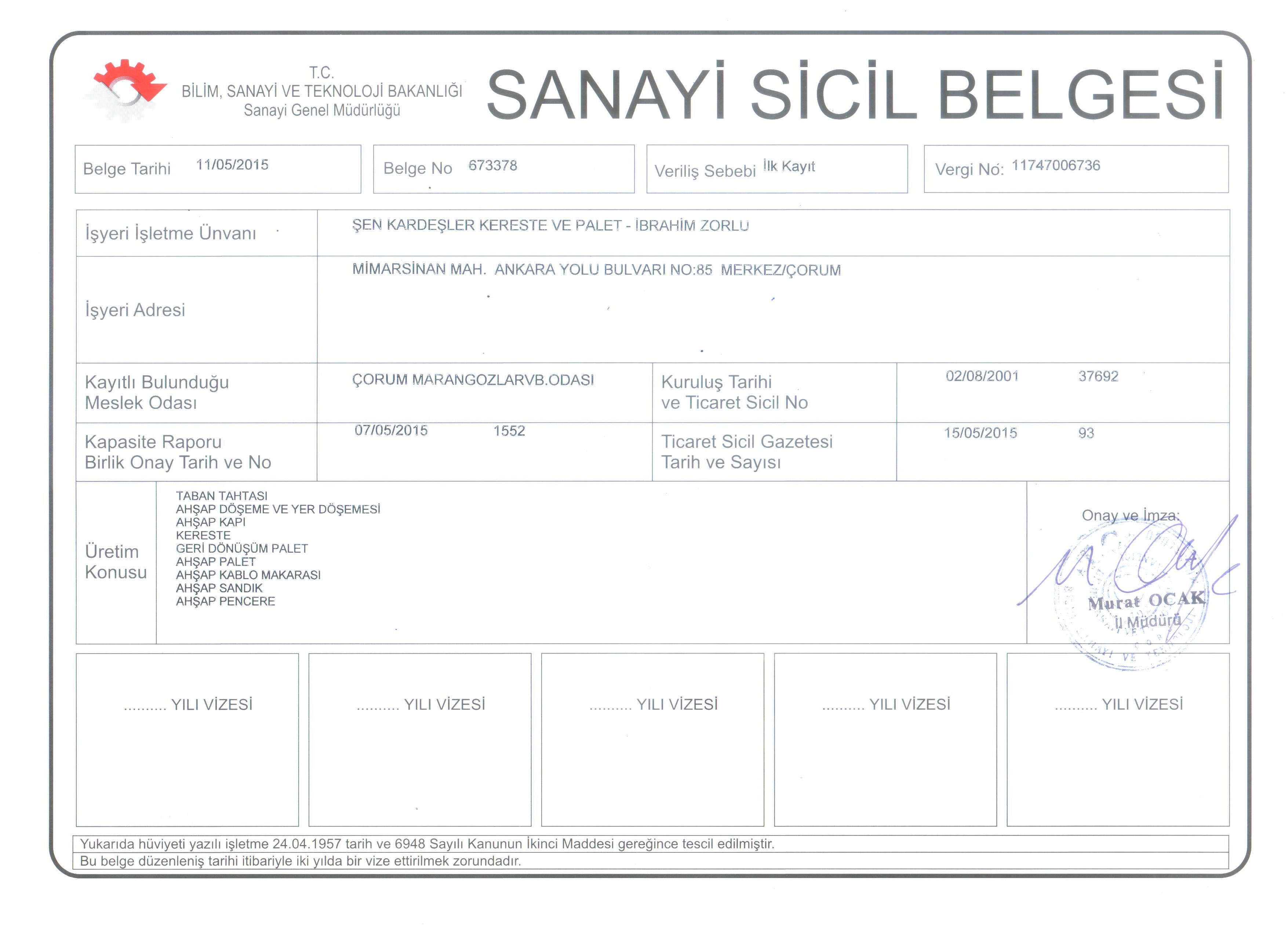 Şenkardeşler Kereste İmalat ve Dekorasyon Malzemeleri Belgeleri
