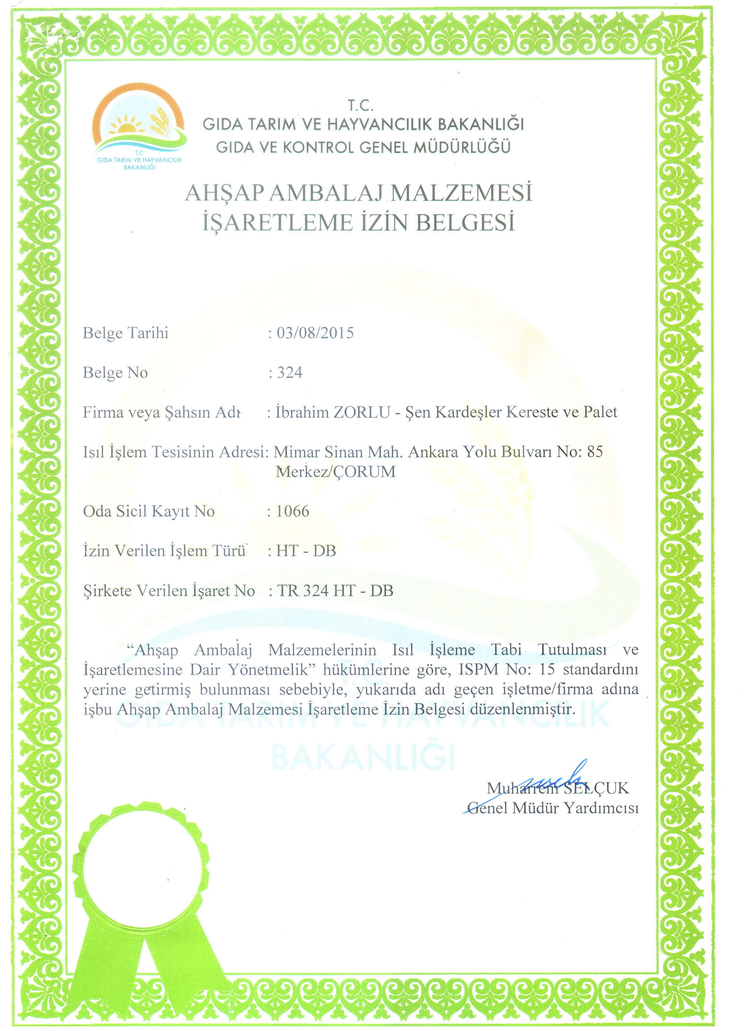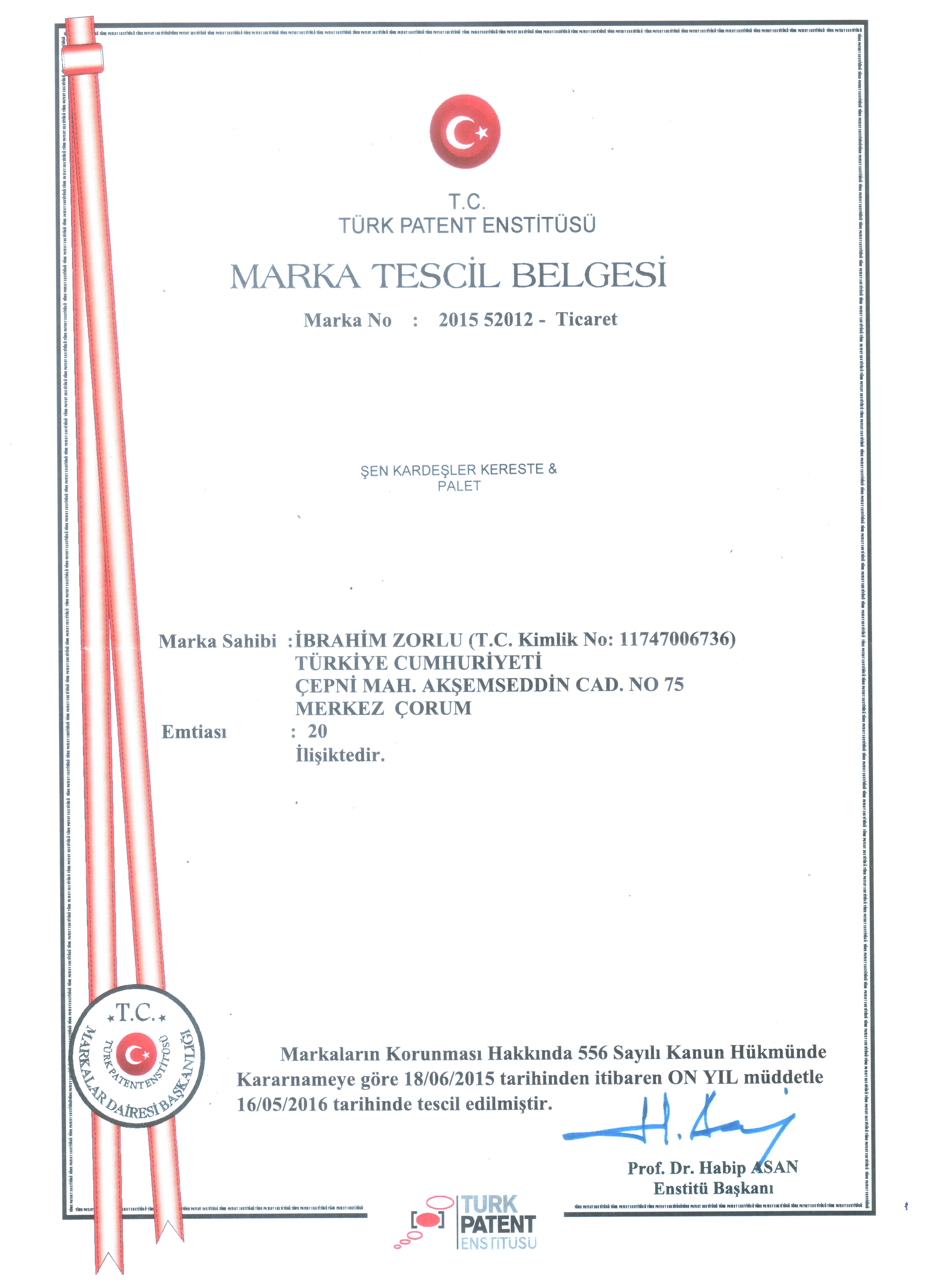 Ahşap Malzeme İşaretleme Belgesi, Marka tescil belgesi, Sanati sicil belgesi belgeleri.